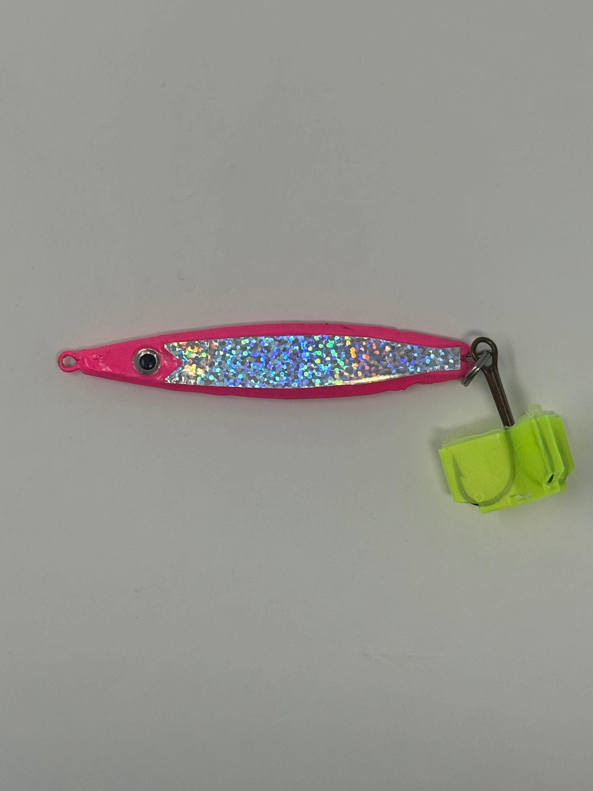 3 ounce flutter jigs are a staple for those summertime stripers. Proven catch-ability and durability. We have shipped our flutters as far as Guam. So I’m sure they work just as well in saltwater. These can be customized with different hook sizes and styles. If you have a custom design in mind, feel free to reach out and we will discuss it.